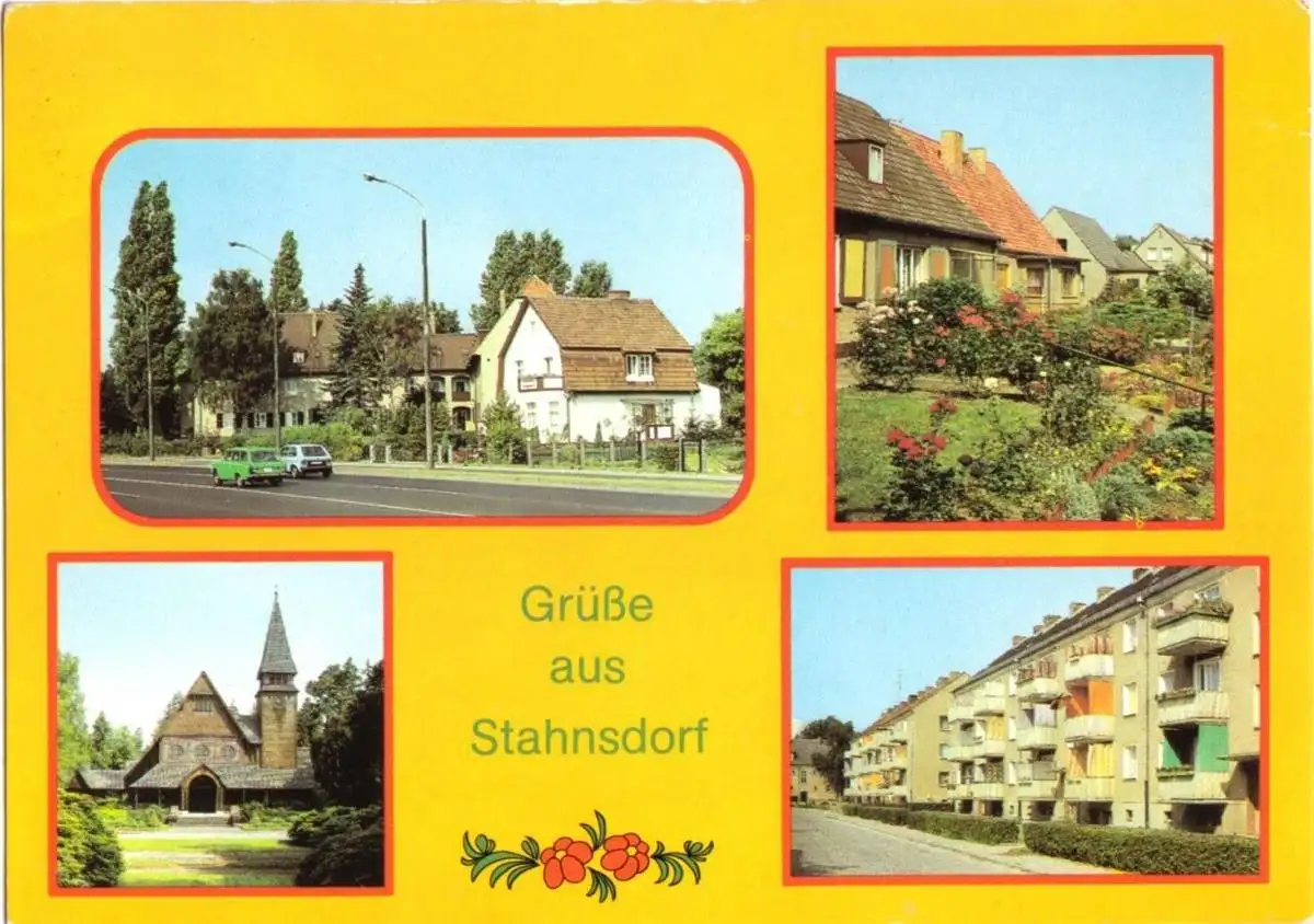 Ansichtskarte Stahnsdorf Kr. Potsdam vier Abb., gestaltet Teilansicht, Heinrich-Zille-Str., Kapelle auf dem Südwest-Friedhof, Neubausiedlung Erhaltung I-II postalisch gelaufen, gestempelt: Stahnsdorf, unleserlich Druckvermerk: 1985 Herstellungsland: DDR Verlag: Bild und Heimat, Reichenbach i. V. - 01 04 0351/12