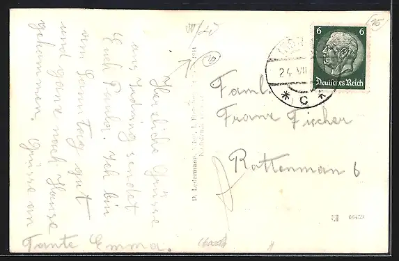 Personenbezogene Daten auf der Rückseite der Karte wurden durch blauen Textmarker unkenntlich gemacht. Die blauen Stellen sind auf die Vorderseite durchgeweicht und wirken sich negativ auf das Postkartenfoto aus