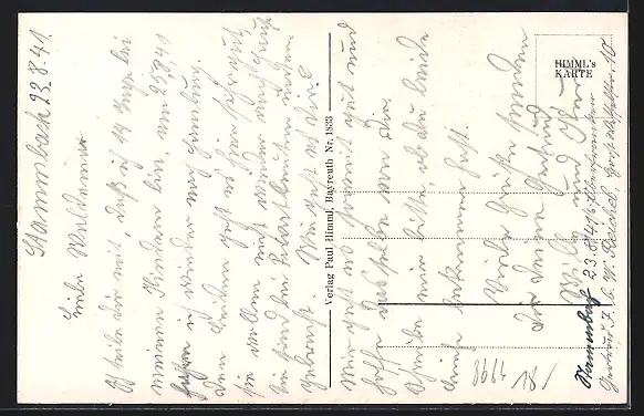 Personenbezogene Daten auf der Rückseite der Karte wurden durch blauen Textmarker unkenntlich gemacht. Die blauen Stellen sind auf die Vorderseite durchgeweicht und wirken sich negativ auf das Postkartenfoto aus