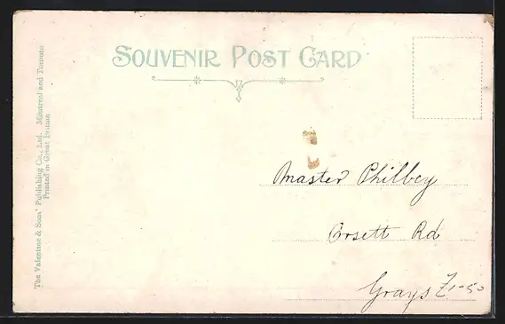 Personenbezogene Daten auf der Rückseite der Karte wurden durch blauen Textmarker unkenntlich gemacht. Die blauen Stellen sind auf die Vorderseite durchgeweicht und wirken sich negativ auf das Postkartenfoto aus