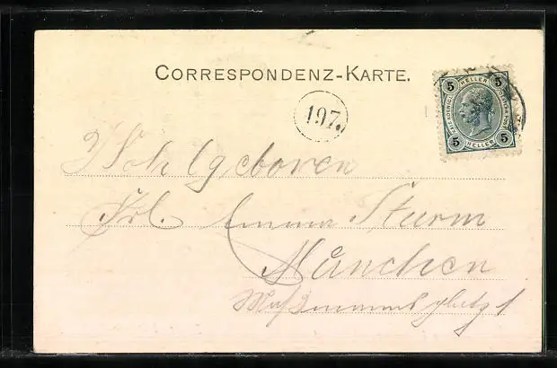 Personenbezogene Daten auf der Rückseite der Karte wurden durch blauen Textmarker unkenntlich gemacht. Die blauen Stellen sind auf die Vorderseite durchgeweicht und wirken sich negativ auf das Postkartenfoto aus