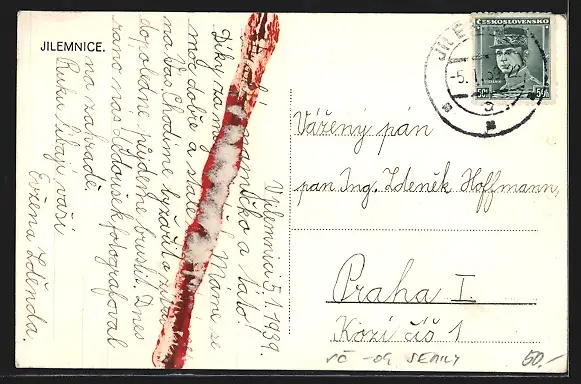 Personenbezogene Daten auf der Rückseite der Karte wurden durch blauen Textmarker unkenntlich gemacht. Die blauen Stellen sind auf die Vorderseite durchgeweicht und wirken sich negativ auf das Postkartenfoto aus