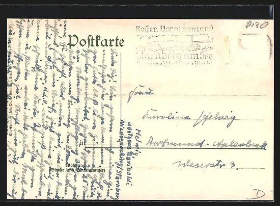 Personenbezogene Daten auf der Rückseite der Karte wurden durch blauen Textmarker unkenntlich gemacht. Die blauen Stellen sind auf die Vorderseite durchgeweicht und wirken sich negativ auf das Postkartenfoto aus