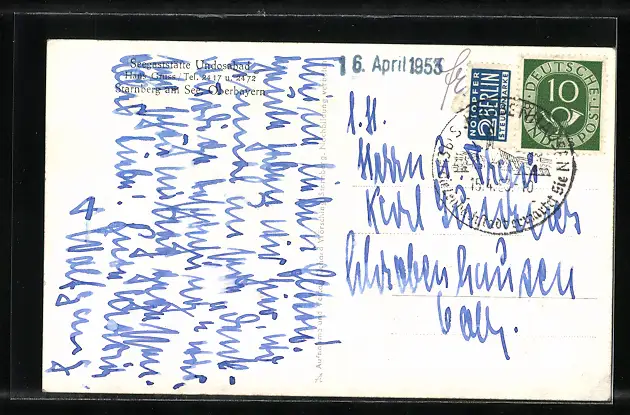 Personenbezogene Daten auf der Rückseite der Karte wurden durch blauen Textmarker unkenntlich gemacht. Die blauen Stellen sind auf die Vorderseite durchgeweicht und wirken sich negativ auf das Postkartenfoto aus