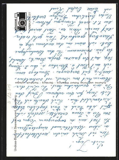 Personenbezogene Daten auf der Rückseite der Karte wurden durch blauen Textmarker unkenntlich gemacht. Die blauen Stellen sind auf die Vorderseite durchgeweicht und wirken sich negativ auf das Postkartenfoto aus