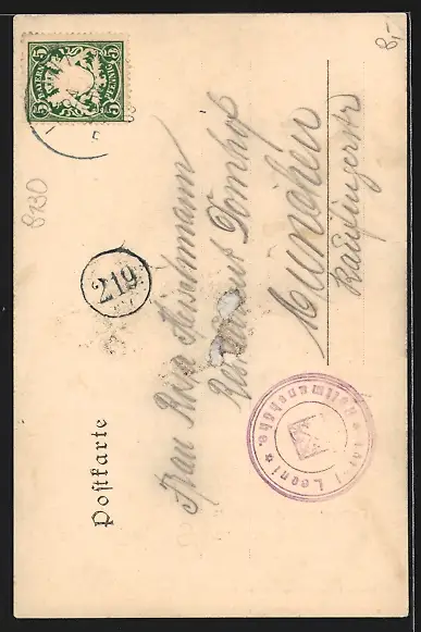 Personenbezogene Daten auf der Rückseite der Karte wurden durch blauen Textmarker unkenntlich gemacht. Die blauen Stellen sind auf die Vorderseite durchgeweicht und wirken sich negativ auf das Postkartenfoto aus