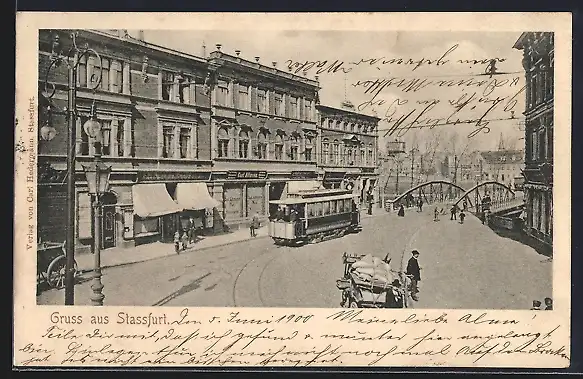 AK Stassfurt, Strassenpartie mit Strassenbahn
