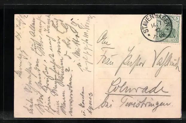 Personenbezogene Daten auf der Rückseite der Karte wurden durch blauen Textmarker unkenntlich gemacht. Die blauen Stellen sind auf die Vorderseite durchgeweicht und wirken sich negativ auf das Postkartenfoto aus