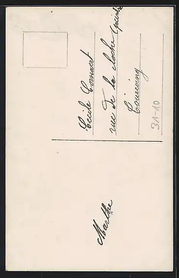Personenbezogene Daten auf der Rückseite der Karte wurden durch blauen Textmarker unkenntlich gemacht. Die blauen Stellen sind auf die Vorderseite durchgeweicht und wirken sich negativ auf das Postkartenfoto aus