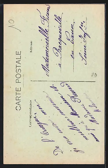 Personenbezogene Daten auf der Rückseite der Karte wurden durch blauen Textmarker unkenntlich gemacht. Die blauen Stellen sind auf die Vorderseite durchgeweicht und wirken sich negativ auf das Postkartenfoto aus