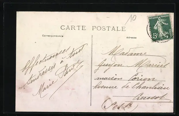 Personenbezogene Daten auf der Rückseite der Karte wurden durch blauen Textmarker unkenntlich gemacht. Die blauen Stellen sind auf die Vorderseite durchgeweicht und wirken sich negativ auf das Postkartenfoto aus