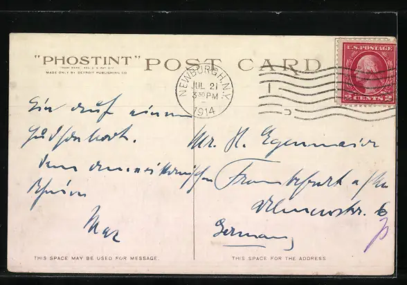 Personenbezogene Daten auf der Rückseite der Karte wurden durch blauen Textmarker unkenntlich gemacht. Die blauen Stellen sind auf die Vorderseite durchgeweicht und wirken sich negativ auf das Postkartenfoto aus
