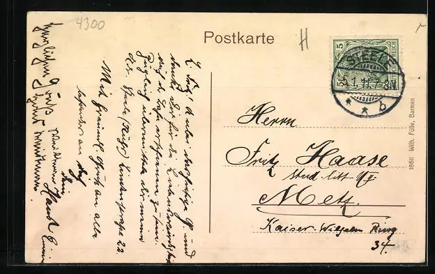 gelaufen 1911, Eckknicke li. unten u. re. oben, guter Zustand