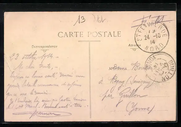 alte Ansichtskarte, gelaufen 1914 als Feldpost, Eckknick re. oben, Bugspur re. unten, guter Zustand