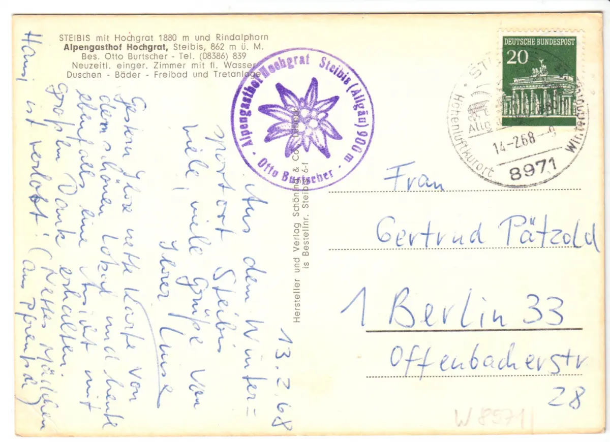 postalisch gelaufen, gestempelt: Steibis, 8971, 14.2.68