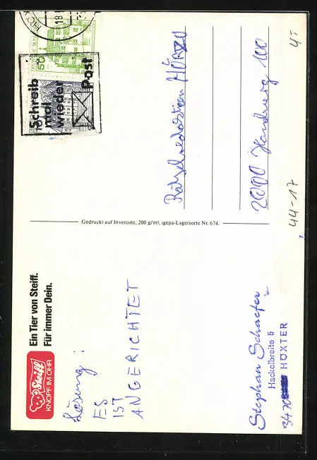 Personenbezogene Daten auf der Rückseite der Karte wurden durch blauen Textmarker unkenntlich gemacht. Die blauen Stellen sind auf die Vorderseite durchgeweicht und wirken sich negativ auf das Postkartenfoto aus