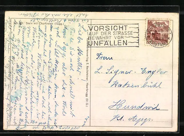 Personenbezogene Daten auf der Rückseite der Karte wurden durch blauen Textmarker unkenntlich gemacht. Die blauen Stellen sind auf die Vorderseite durchgeweicht und wirken sich negativ auf das Postkartenfoto aus