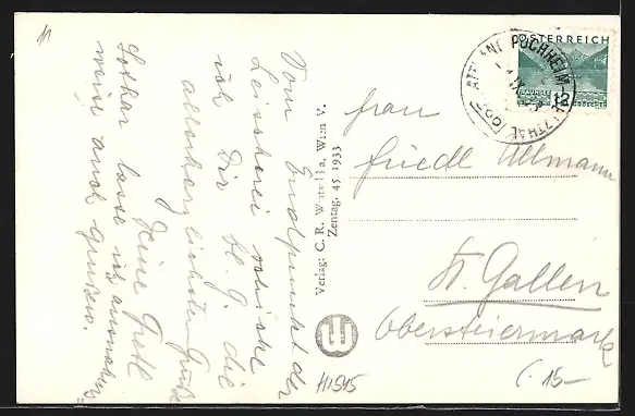 Personenbezogene Daten auf der Rückseite der Karte wurden durch blauen Textmarker unkenntlich gemacht. Die blauen Stellen sind auf die Vorderseite durchgeweicht und wirken sich negativ auf das Postkartenfoto aus