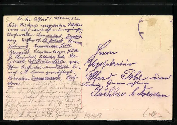 Personenbezogene Daten auf der Rückseite der Karte wurden durch blauen Textmarker unkenntlich gemacht. Die blauen Stellen sind auf die Vorderseite durchgeweicht und wirken sich negativ auf das Postkartenfoto aus