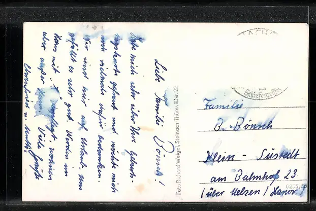 Personenbezogene Daten auf der Rückseite der Karte wurden durch blauen Textmarker unkenntlich gemacht. Die blauen Stellen sind auf die Vorderseite durchgeweicht und wirken sich negativ auf das Postkartenfoto aus
