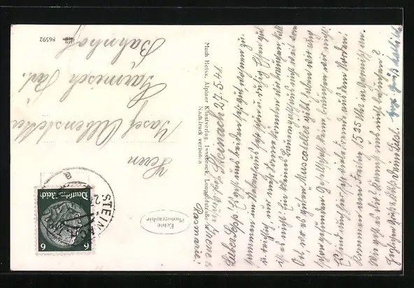 Personenbezogene Daten auf der Rückseite der Karte wurden durch blauen Textmarker unkenntlich gemacht. Die blauen Stellen sind auf die Vorderseite durchgeweicht und wirken sich negativ auf das Postkartenfoto aus