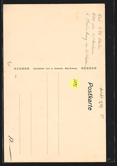 Personenbezogene Daten auf der Rückseite der Karte wurden durch blauen Textmarker unkenntlich gemacht. Die blauen Stellen sind auf die Vorderseite durchgeweicht und wirken sich negativ auf das Postkartenfoto aus