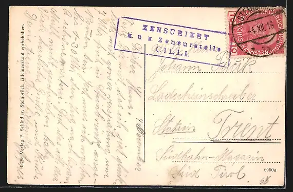 Personenbezogene Daten auf der Rückseite der Karte wurden durch blauen Textmarker unkenntlich gemacht. Die blauen Stellen sind auf die Vorderseite durchgeweicht und wirken sich negativ auf das Postkartenfoto aus