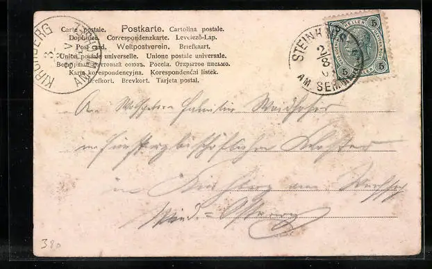 Personenbezogene Daten auf der Rückseite der Karte wurden durch blauen Textmarker unkenntlich gemacht. Die blauen Stellen sind auf die Vorderseite durchgeweicht und wirken sich negativ auf das Postkartenfoto aus