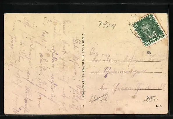 Personenbezogene Daten auf der Rückseite der Karte wurden durch blauen Textmarker unkenntlich gemacht. Die blauen Stellen sind auf die Vorderseite durchgeweicht und wirken sich negativ auf das Postkartenfoto aus