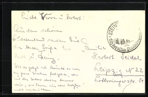 Personenbezogene Daten auf der Rückseite der Karte wurden durch blauen Textmarker unkenntlich gemacht. Die blauen Stellen sind auf die Vorderseite durchgeweicht und wirken sich negativ auf das Postkartenfoto aus