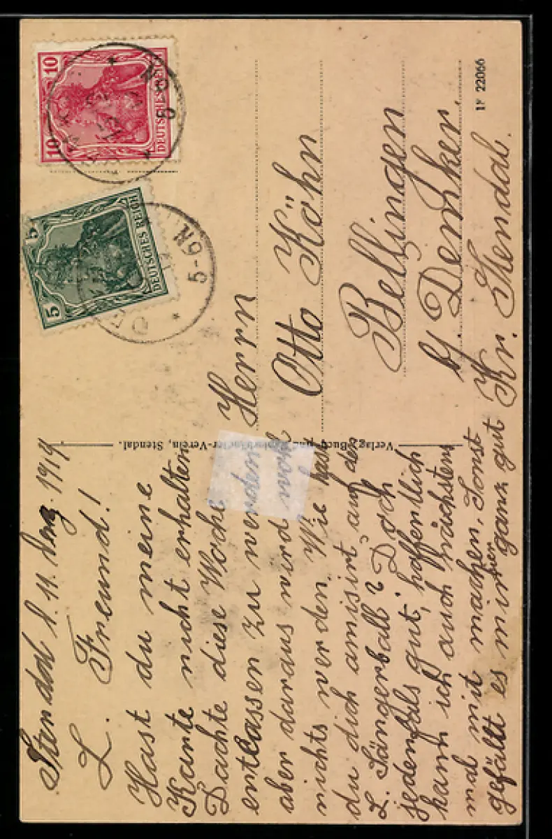 alte Ansichtskarte, gelaufen, Bugspur oben mittig, rückseitig Klebe- und Papierreste, guter Zustand