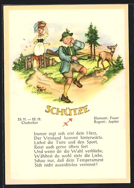 AK Sternzeichen Schütze, Jäger guckt einer Frau hinterher