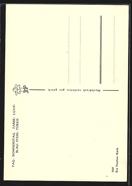Personenbezogene Daten auf der Rückseite der Karte wurden durch blauen Textmarker unkenntlich gemacht. Die blauen Stellen sind auf die Vorderseite durchgeweicht und wirken sich negativ auf das Postkartenfoto aus