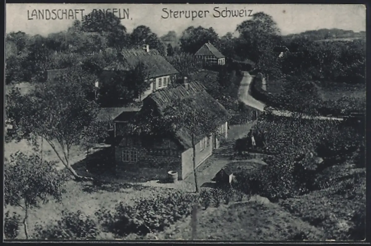 AK Sterup, Landschaft Angeln, Reetgedeckte Häuser