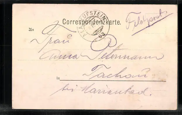 Personenbezogene Daten auf der Rückseite der Karte wurden durch blauen Textmarker unkenntlich gemacht. Die blauen Stellen sind auf die Vorderseite durchgeweicht und wirken sich negativ auf das Postkartenfoto aus