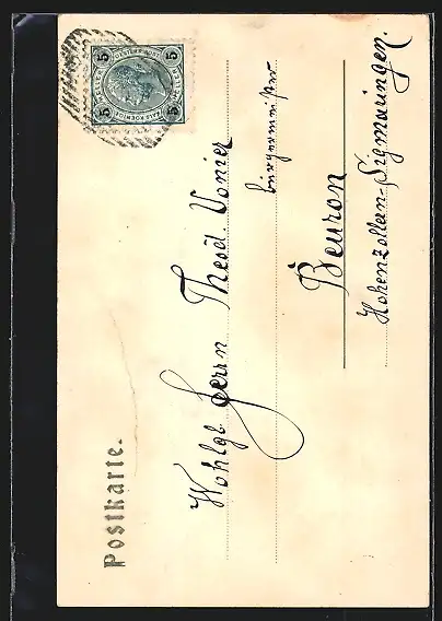 Personenbezogene Daten auf der Rückseite der Karte wurden durch blauen Textmarker unkenntlich gemacht. Die blauen Stellen sind auf die Vorderseite durchgeweicht und wirken sich negativ auf das Postkartenfoto aus