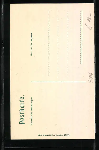 Personenbezogene Daten auf der Rückseite der Karte wurden durch blauen Textmarker unkenntlich gemacht. Die blauen Stellen sind auf die Vorderseite durchgeweicht und wirken sich negativ auf das Postkartenfoto aus