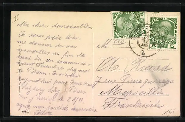 Personenbezogene Daten auf der Rückseite der Karte wurden durch blauen Textmarker unkenntlich gemacht. Die blauen Stellen sind auf die Vorderseite durchgeweicht und wirken sich negativ auf das Postkartenfoto aus