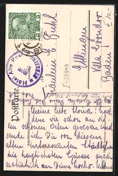 Personenbezogene Daten auf der Rückseite der Karte wurden durch blauen Textmarker unkenntlich gemacht. Die blauen Stellen sind auf die Vorderseite durchgeweicht und wirken sich negativ auf das Postkartenfoto aus