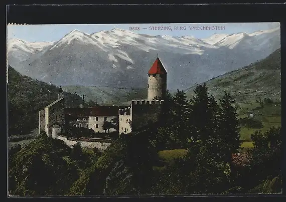 AK Sterzing, Partie an der Burg Sprechenstein mit Gebirgspanorama