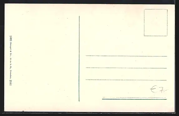 Personenbezogene Daten auf der Rückseite der Karte wurden durch blauen Textmarker unkenntlich gemacht. Die blauen Stellen sind auf die Vorderseite durchgeweicht und wirken sich negativ auf das Postkartenfoto aus