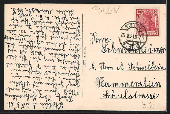 Personenbezogene Daten auf der Rückseite der Karte wurden durch blauen Textmarker unkenntlich gemacht. Die blauen Stellen sind auf die Vorderseite durchgeweicht und wirken sich negativ auf das Postkartenfoto aus