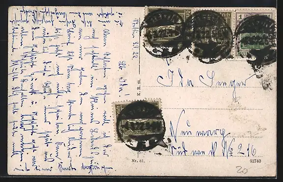alte Ansichtskarte, gelaufen 1922, Eckknicke li., Abriebspur re. oben, guter Zustand