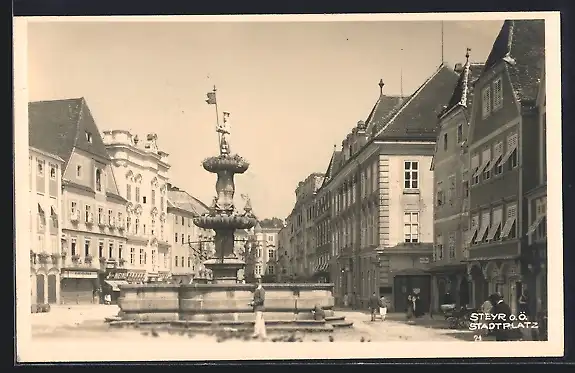 AK Steyr /O. Ö., Stadtplatz mit Brunnen