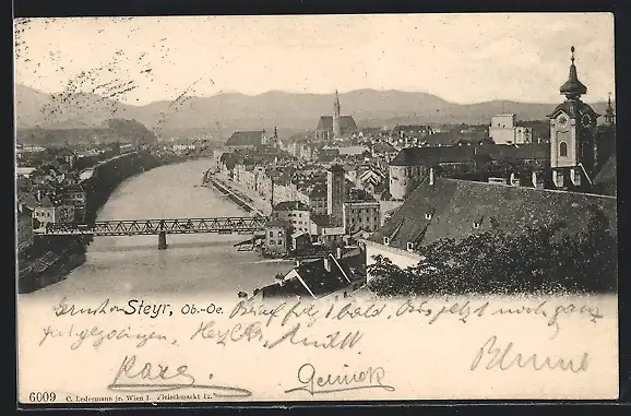 AK Steyr /Ob.-Oe., Ortsansicht mit Brücke aus der Vogelschau