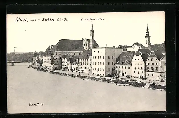 AK Steyr /Ob.-Oe., Ortsansicht mit Stadtpfarrkirche am Ennsfluss