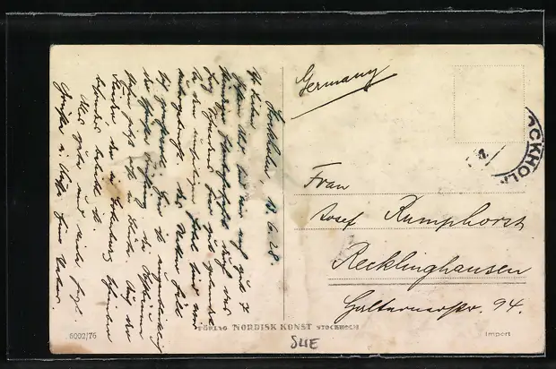 Personenbezogene Daten auf der Rückseite der Karte wurden durch blauen Textmarker unkenntlich gemacht. Die blauen Stellen sind auf die Vorderseite durchgeweicht und wirken sich negativ auf das Postkartenfoto aus