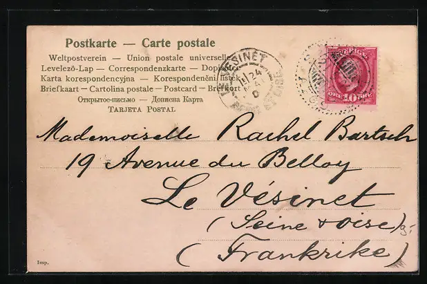 Personenbezogene Daten auf der Rückseite der Karte wurden durch blauen Textmarker unkenntlich gemacht. Die blauen Stellen sind auf die Vorderseite durchgeweicht und wirken sich negativ auf das Postkartenfoto aus