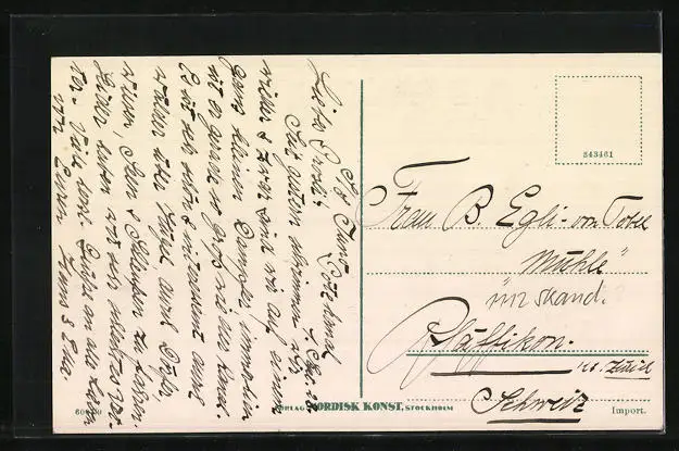 Personenbezogene Daten auf der Rückseite der Karte wurden durch blauen Textmarker unkenntlich gemacht. Die blauen Stellen sind auf die Vorderseite durchgeweicht und wirken sich negativ auf das Postkartenfoto aus