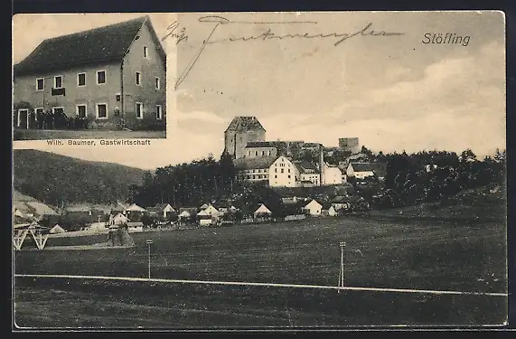 AK Stöfling, Gasthaus Wilh. Baumer und Ortsansicht mit Burg